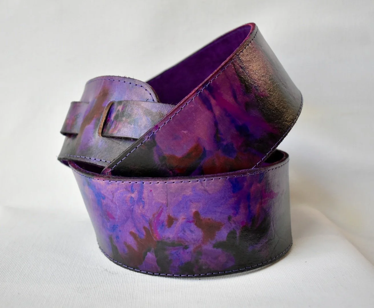 Custom, one of a kind, hand dyed genuine leather guitar strap with purple suede backing and purple stitching.
