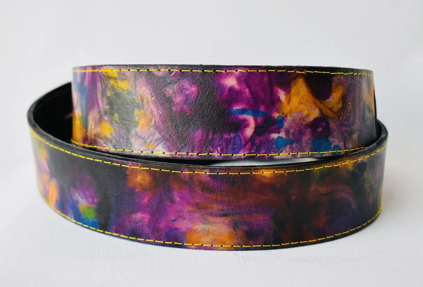 Custom, one of a kind, hand dyed genuine leather guitar strap with brown suede backing.
