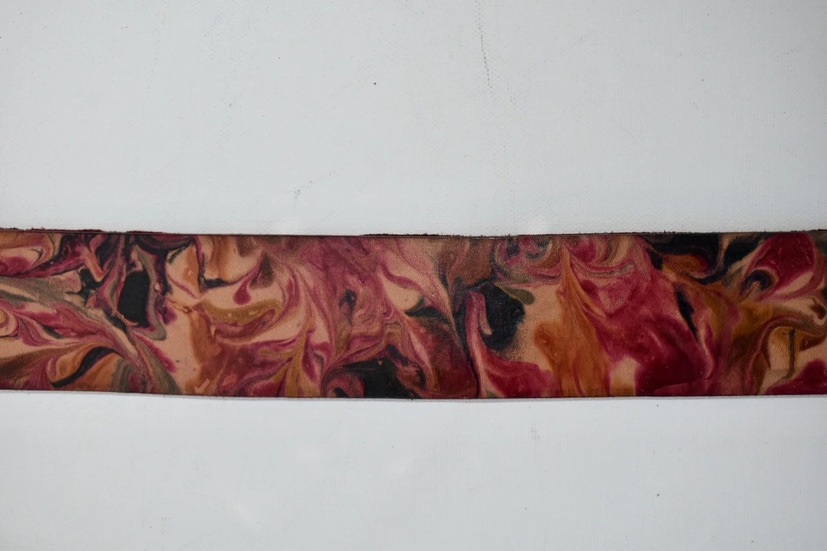 Custom, one of a kind, hand dyed genuine leather guitar strap with dark red suede backing.