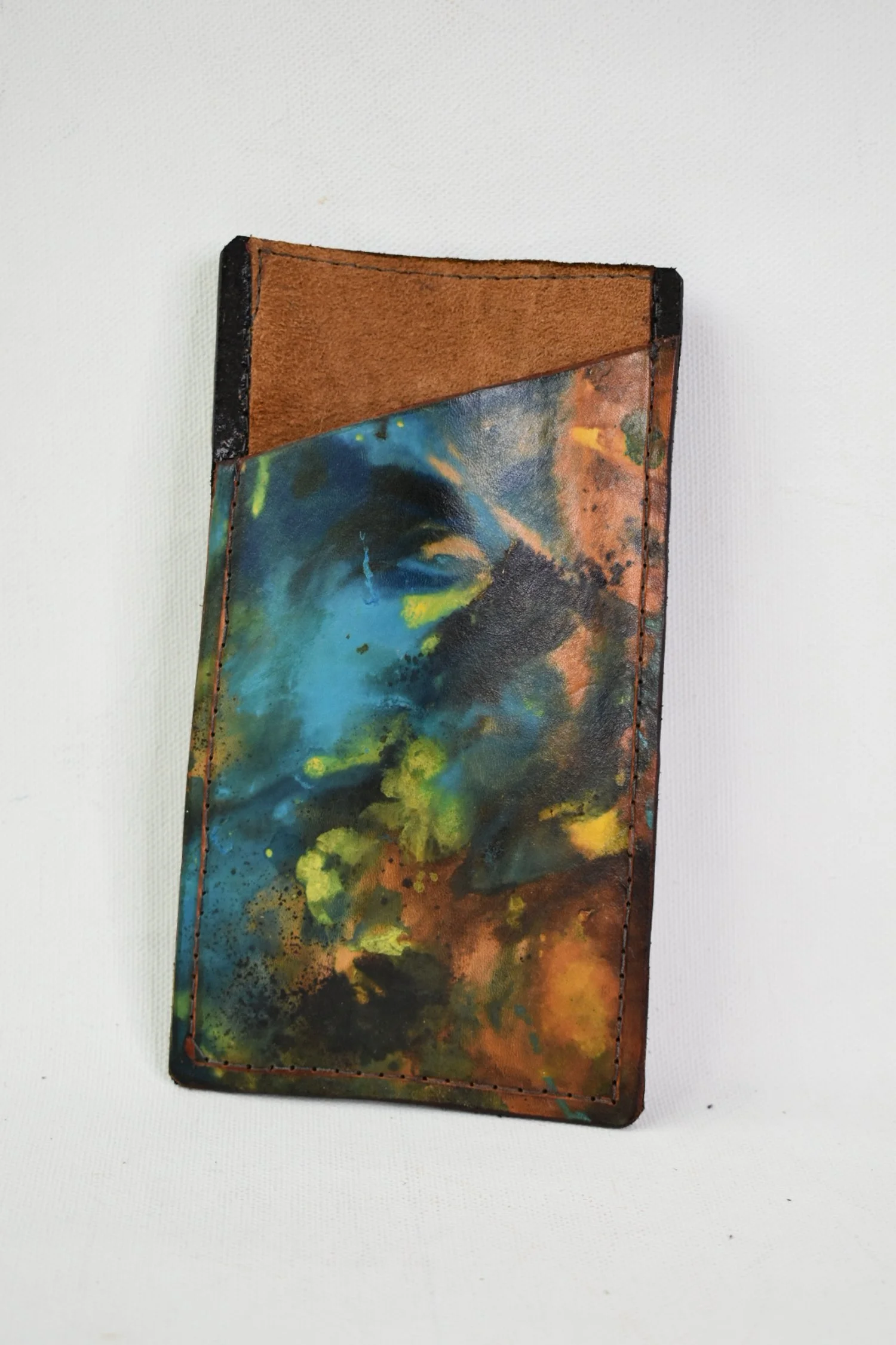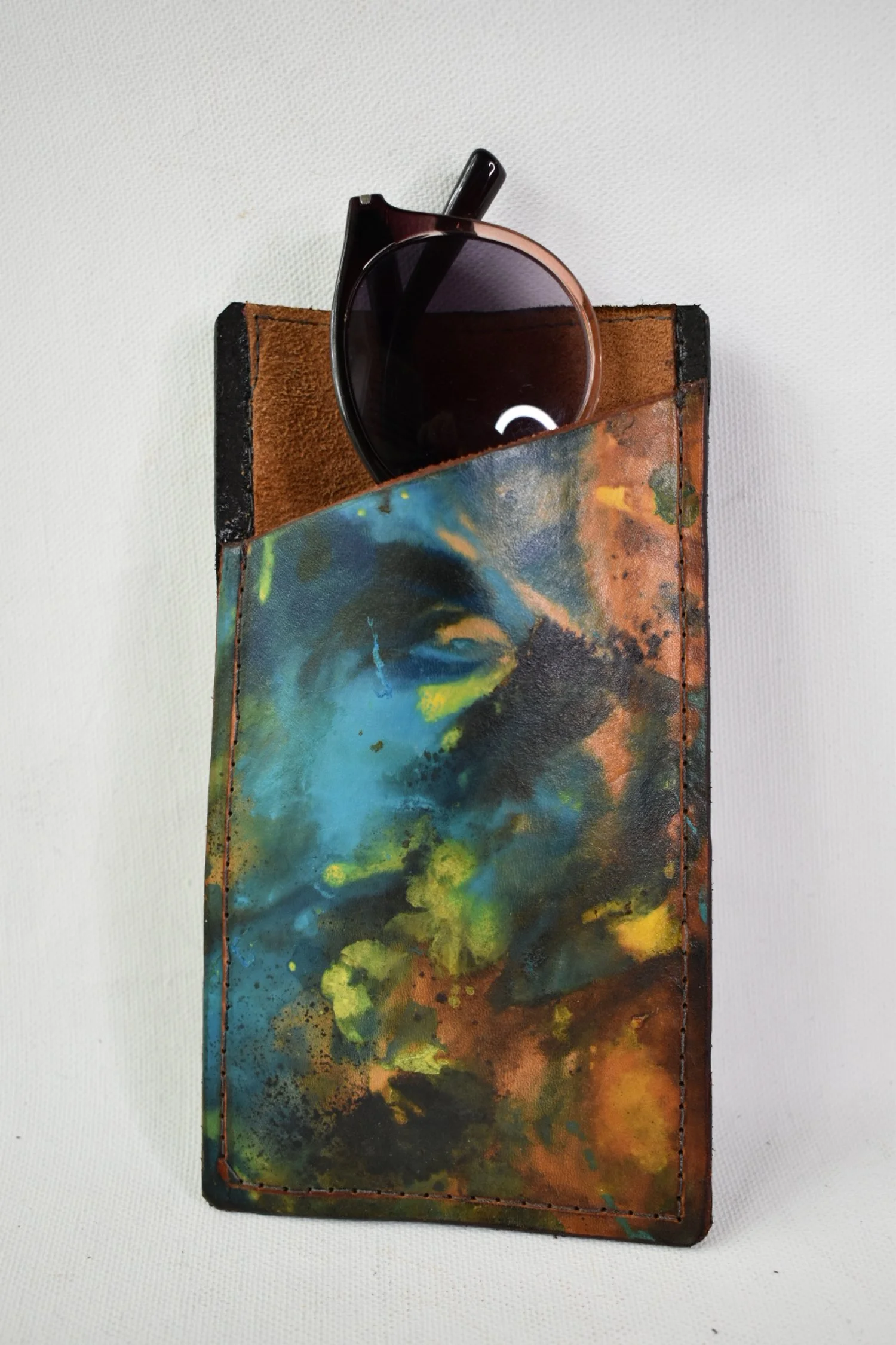 Custom dyed genuine leather sunglass case. Interior is camel color suede lined.